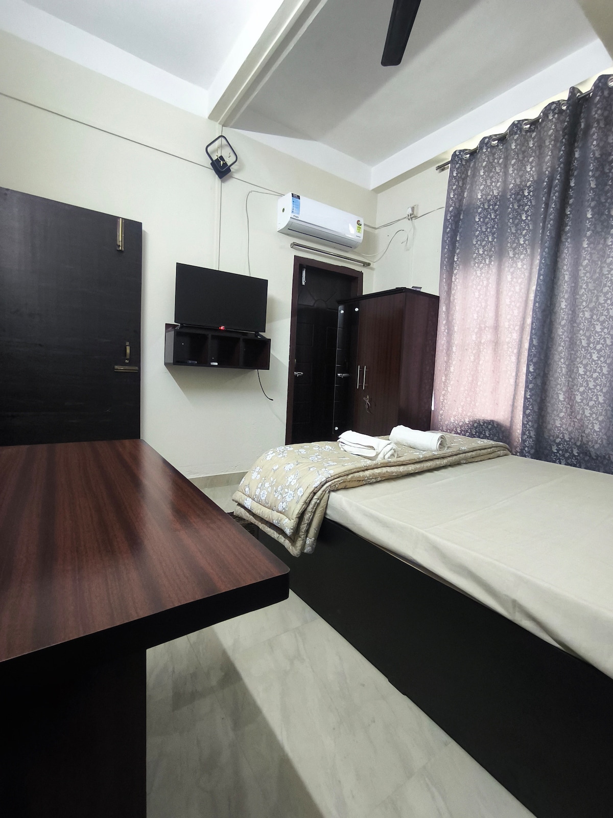 It's a cozy beautiful A/c Single bed room Apartment with 1 double (King size )bed,wardrobe,dressing table attached bathroom and large fully serviced kitchen,balcony and private terrace on 3rd floor ( sorry no lift )of our bungalow. Can fit one extra bed if required ideal for 2 but can sleep 3 .The apartment is beautiful & spacious and very convenient in terms of location and communication. It's very suitable for family, solo travelers and business trip and backpacker and for longer stays