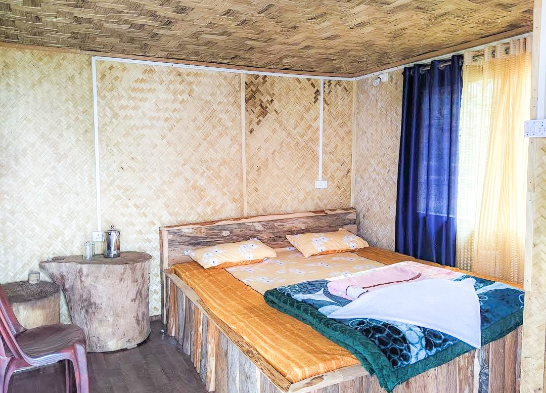 The Traditional Bamboo huts are located inside a complex on the hill side and offer ample light and ventilation & open space. Twin huts have a double bed, Quad hut has 1 dbl and 2 single beds with a lot of space.There is a fireplace on one side of the hut (A clearing where 8-10 people can sit and have fun/cook etc. And an open area with a bench, a Tree-shed in a Mango tree that can accommodate a party of 4 (2 can sleep comfortably) open air washbasin, and washrooms on the other side of the hut.