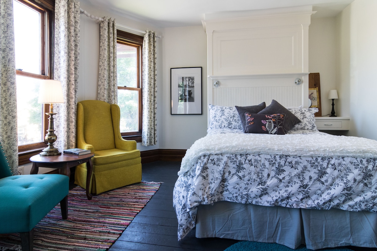 “The Commodore Perry Suite” Room 7 (sleeps 5) This historical suite honors the hero of the Battle of Lake Erie. Located on the 1st floor, it sleeps up to five guests with a 4-post king bed with sterns and foster hybrid mattress, two twin daybeds & a pop-up trundle. The room features Commodore Perry artwork, dresser, 55” TV, and USB charging lamps. The spacious bathroom includes grab bars and a shower stall. Enjoy a self-serve continental breakfast on weekdays and a hot breakfast on weekends. Bo