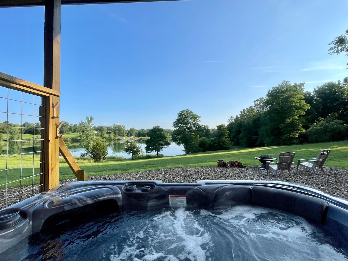 A quaint, cozy newly remodeled in 2025 cabin on 60 wooded acres perfect for a couples getaway. 8 minutes to a great downtown for shopping unique boutiques, dining, local wineries, breweries and distillery! Enjoy peace & tranquility in natures setting. Cozy up to a massive stone wood burning fireplace both inside and on the screened in porch. The brand new private hot tub boasts natural spring water and is just outside the door from the cabin and overlooks the natural spring ponds.