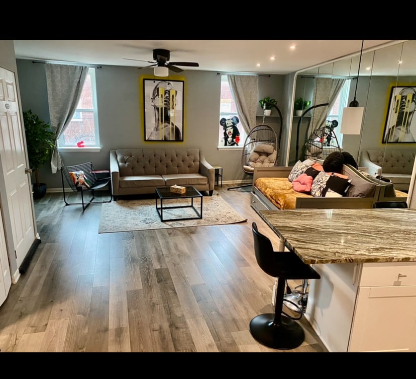 This beautiful renovated apartment is in a lovely location in Roxborough-Manayunk section of Philadelphia. It is huge! 15+foot ceilings and open floorplan allow for the most comfortable space. Natural light pours in all day through the oversized windows. A king size bed awaits on the main bedroom and a queen bed is at the opposite end of the 1400 sq ft loft space to provide privacy. Commercial License- 1177754 Limited Lodging License-003468 PENDING