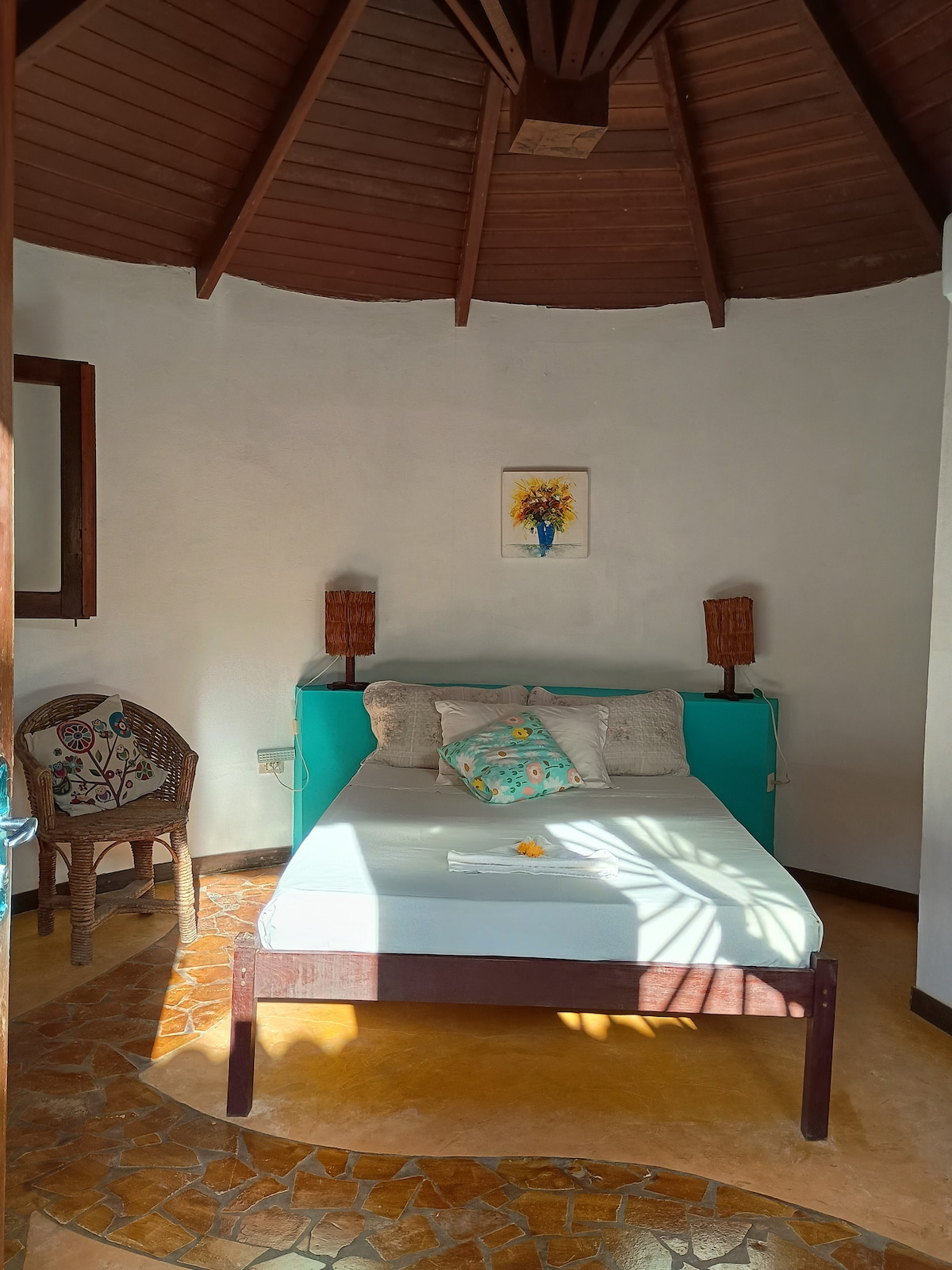 The boutique experience Discover this colorful, artistic getaway overlooking the Bay of Todos os Santos. Enjoy exclusive access to the third floor featuring a cozy bedroom, stylish living room and a small open-air kitchenette. Relax on the roof top with a tub and open-air shower while enjoying breathtaking sunsets. You’ll be sharing the rest of the house with my family, 2 friendly dogs & 2 cats. We offer a delightful breakfast in the main kitchen.