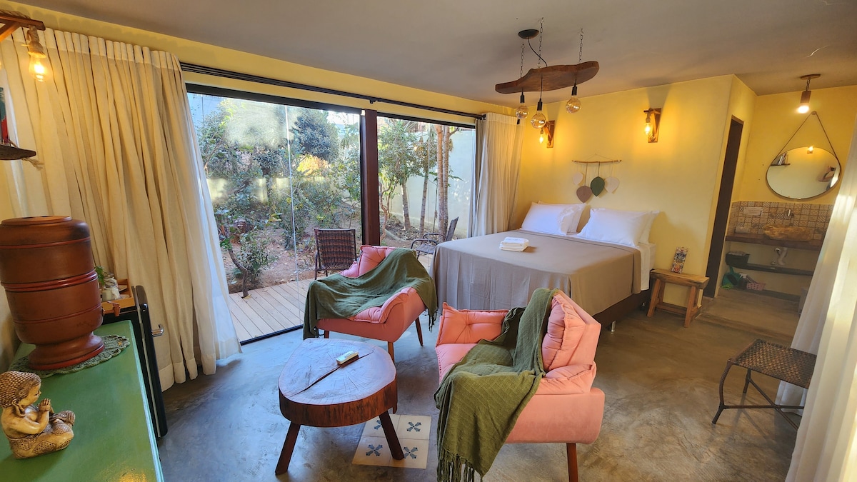 É um espaço calmo e cheio de estilo à 200 metros da praia, em meio a vegetação nativa! Somos LGBTQIAP+ friendly e por estarmos afastados do núcleo da comunidade desfrutamos de silêncio e tranquilidade mas a cinco minutos do agito! A suíte com vista para as árvores é garantia de descanso. A cozinha com teto de piaçava é linda e está preparada com o necessário. A sala de banho conta com espaços reservados que garante a sua intimidade. Relaxe neste espaço! Você vai adorar!