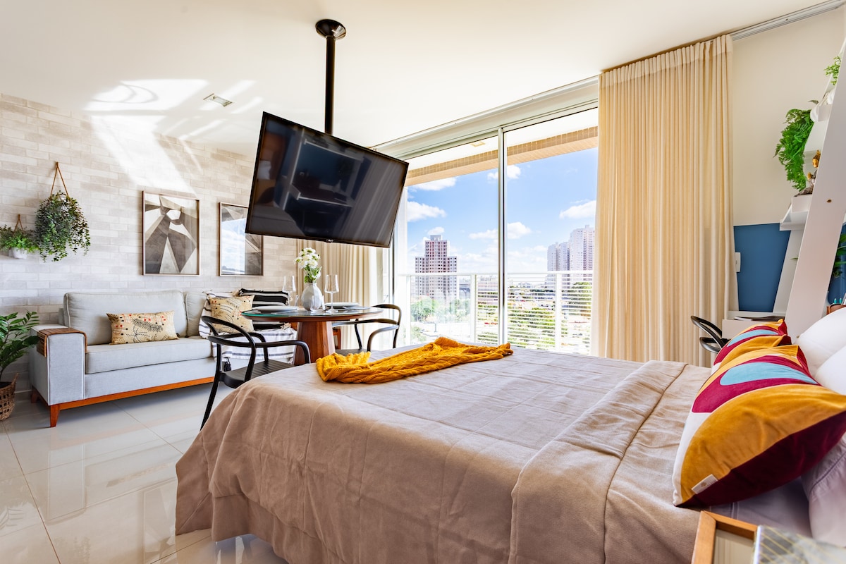 Luxurious apartment with panoramic views and direct access to DF Plaza Shopping. The bedroom has a queen bed, a living room with a 55" Smart TV, and a fully equipped kitchen and bathroom. Prime location: restaurants, supermarkets, and metro nearby. The condominium features an infinity pool, gym, workspace, and more. Fast Wi-Fi, private parking, and 24-hour security. It is ideal for couples, professionals, and discerning tourists. Peaceful environment. Experience the best with sophistication.