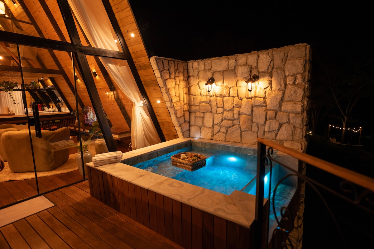 Siga nossa rede social@CABANAS LAGO DA COLINA -Cesta de café da manhã inclusa - Cozinha completa com vista para o por do sol; - Espaço com Firepit (lenha inclusa); - Piscina aquecida e com cromoterapia; - Alexa; - Smartv; - Vista para o lago; - Redário suspenso no deck; - Duas Duchas aquecidas na área de banho; - Torneiras e ducha higiênica aquecidas; - Roupa de cama, banho, roupões e pantufas; - Cama de casal Queen; - Redário no jardim - Banheiro de vidro com vista para a natureza; - Wi-Fi