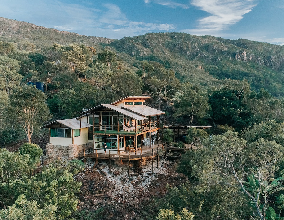 Lindo e romântico chalé, com belíssima vista para a Serra Santana onde se localiza o Parque Nacional da Chapada dos Veadeiros. A acomodação, com arquitetura moderna, tem como propósito ser um refúgio em meio a um dos mais ricos biomas do planeta: o cerrado. Dispõe de um amplo deck panorâmico, lugar especial para curtir a lua cheia na chapada. Após um dia cheio de aventuras pelas trilhas e cachoeiras da região, relaxe apreciando as cores do sol poente refletidas na serra.