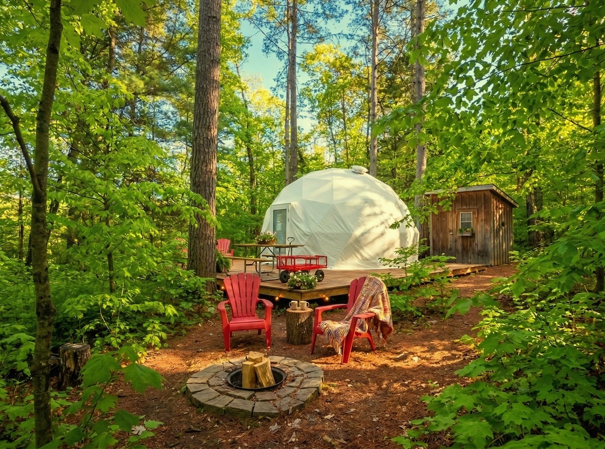 The Meadow Dome is a private oasis surrounded by 98 acres of gorgeous nature you will have all to yourself. •NEW natural pool •Cedar cabin sauna •Chemical-free hot tub •Walking trails •Indoor fireplace •Outdoor fire pit Close to Algonquin Park Surrounded by thousands of lakes. Meadow Dome is an ideal spot if you want to unwind and enjoy nature at its finest. Meadow Dome is solar powered with wood heating and drinking water provided. There is a close by outhouse.