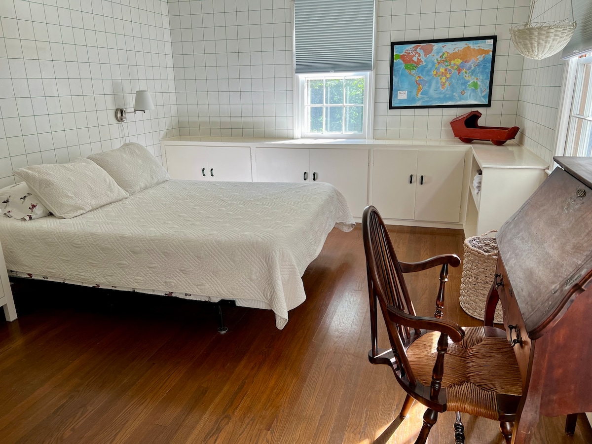 LGBTQ friendly. Our 1915 Arts & Crafts bungalow's spacious in-law suite offers driveway parking, private entrance, sunroom, king bedroom, en-suite bath, kitchenette w/fridge, micro, coffee maker, toaster. Relax in bed with 40" HDTV with Amazon Prime, HBO Max, Netflix, premium cable. Enjoy private gardens to sun, read a book or cup of coffee. Short drive to 4 Vineyards, Theater and the train station. I am not responsible for wifi.