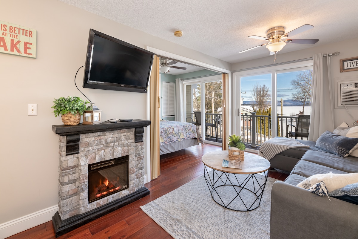 Designed for couples seeking a cozy Lake George escape, this intimate king studio features a fireplace, jacuzzi tub, and warm Adirondack charm. Perfect for anniversaries, weekend getaways, or quiet retreats for two. While the space is intentionally compact, it’s rich in comfort and atmosphere. Enjoy access to the pool, hot tub, beach, firepit, and free kayaks and paddleboards—ideal for guests who plan to be out enjoying the lake and village.