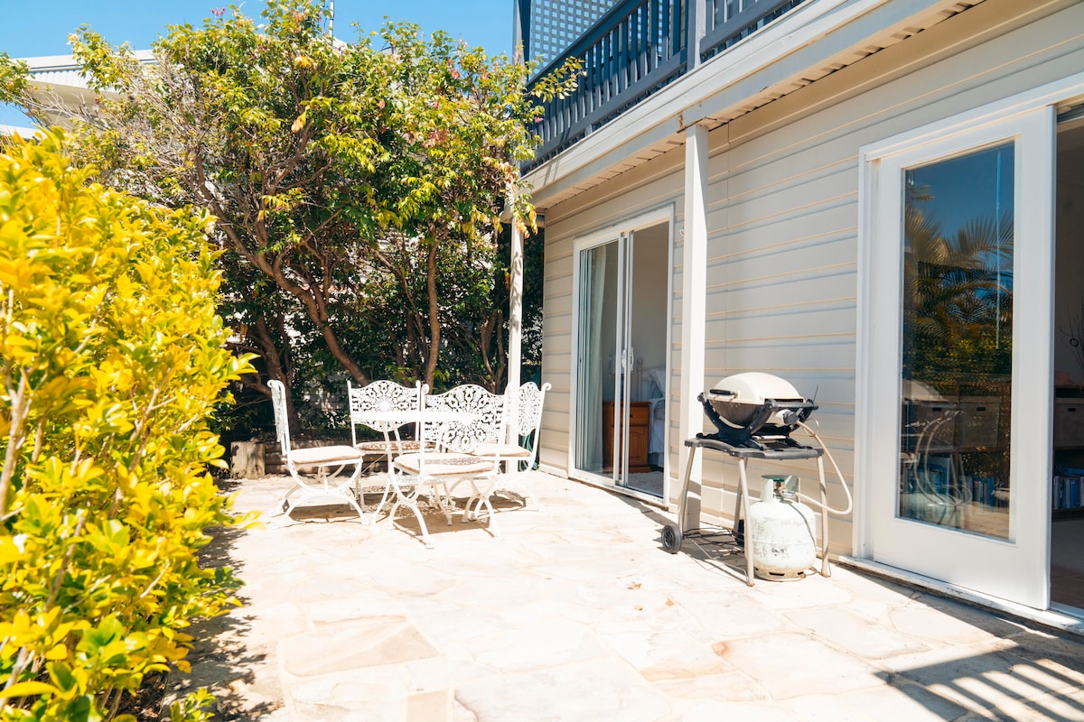 Light & airy 1 bedroom garden flat with seperate entrance. Just built with soaring ceilings, exposed beams & polished concrete floors . There is a loft space in the bedroom for you to explore. A great spot to read a book or take a nap. There is a separate lounge/ kitchen with glass sliding doors that lead onto a deck with views of the garden. The deck is north facing & sun drenched. You have your own full kitchen and a combined bathroom laundry. For comfort you have ceiling fans & A/c.