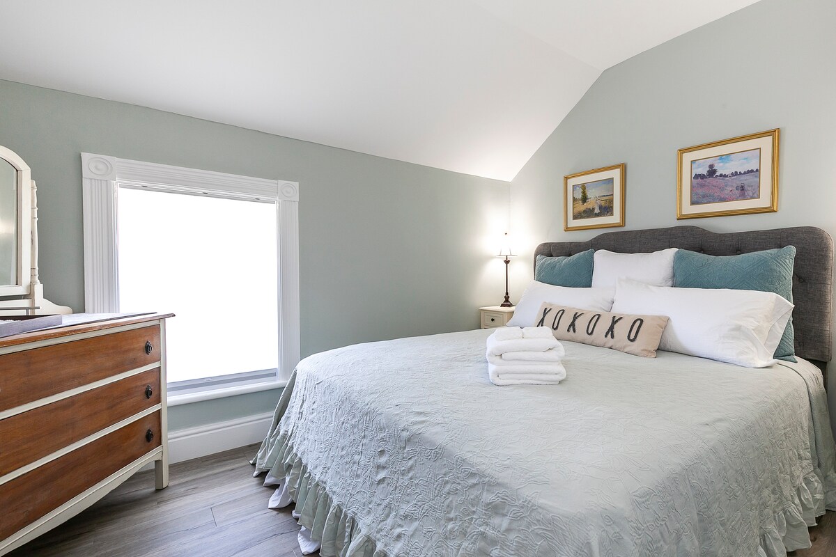 This spacious ground floor room sleeps a converted king bed (two twins joined). The daybed is dressed as a sofa (converting to a twin or king bed for groups of 3-4). A private ensuite bathroom, includes linens (no beach towels), soap/shampoo/body wash, hairdryer. Our fresh hearty breakfasts are very popular! Served in your suite, or outdoors, we accommodate all dietary restrictions. Dishware, kettle & tea in room. The rooms are naturally cool, and have ceiling fans, but no AC.