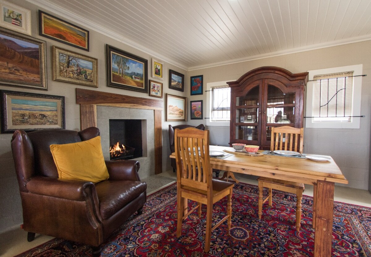 A quiet, private and peaceful cottage 17km from Graaff-Reinet . Surrounded by nature and mountains. Abundant birdlife. Endless scope for walking, hiking, mountain biking and picnics. 4x4 roads. Looking beautiful after some rain! Cottage has fully equipped kitchen and 2 en-suite bedrooms as well as a sleeper couch in the living area. Living area has airconditioning. Indoor fireplace and outdoor braai. Use of swimming pool . A place to relax.