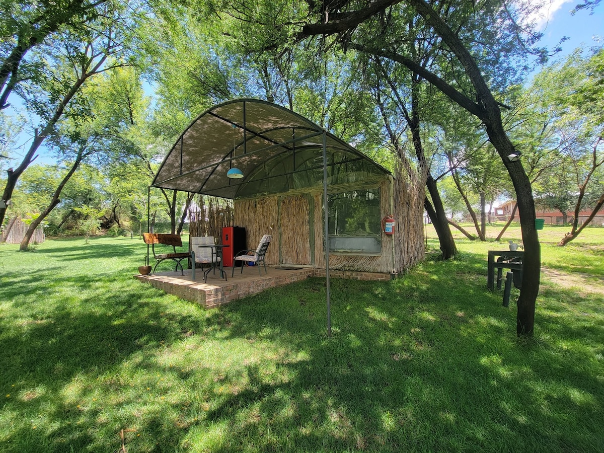 The African Darter hut is the perfect place to stretch out and relax. Double bed with Cool Gel Memory Foam mattress Synthetic, temperature regulating, feather duvet Clean linen, extra blankets, and towels En-suite bathroom Kitchen with gasstove Kitchenware Refrigerator Covered porch with table and chairs Picnic Blankets Braai (barbeque) area & 1 bag of charcoal per day Solar power- Sufficient light, as well as power points to charge electronic devices.