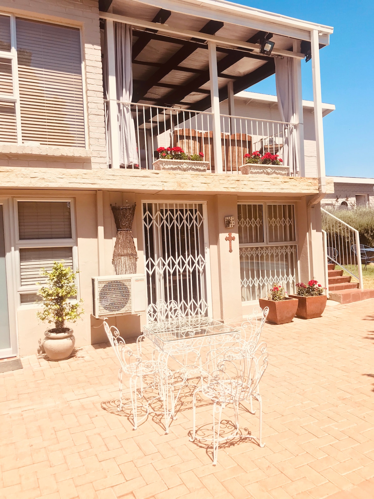 KarooSjiek Self-catering up to 8 sleeper unit is your Home-Away-from-Home. Large, enclosed pet friendly garden, shared swimming pool &braai facilities. Air Conditioning for cooling and heating. Bedroom 1: Queen bed, ¾ bed & ensuite bathroom. Bedroom 2: Queen bed Separate Bathroom Open Plan Living space with Dubble bed and a ¾ bed, Comfortable TV Lounge with Full DSTV and fully well-equipped kitchen. Undercover veranda is equipped with outdoor furniture & built-in braai. Free Wi-fi is available.