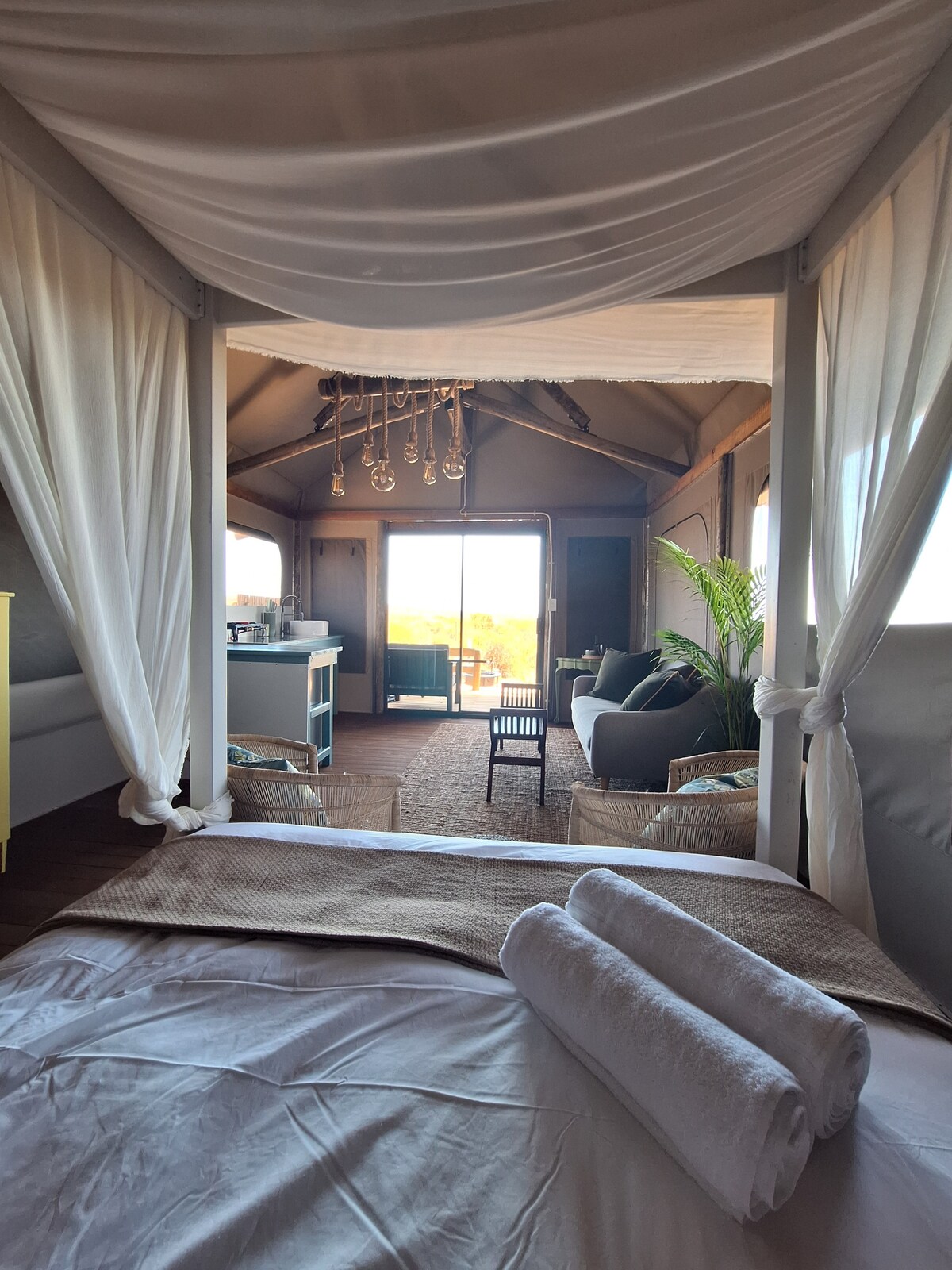 Enjoy the lovely setting of this romantic spot in nature. Wake up to the birds singing and watch the sun set over the ocean! Take a nice hot bath on the deck with the fire going in the firepit. All the basics you will need, with an extra special touch to detial. The tents are only 7km from Paternoster, so a quick drive to a town with loads of restaurants and a beautiful beach. You will definitely feel spoiled and rejuvenated after your stay!!