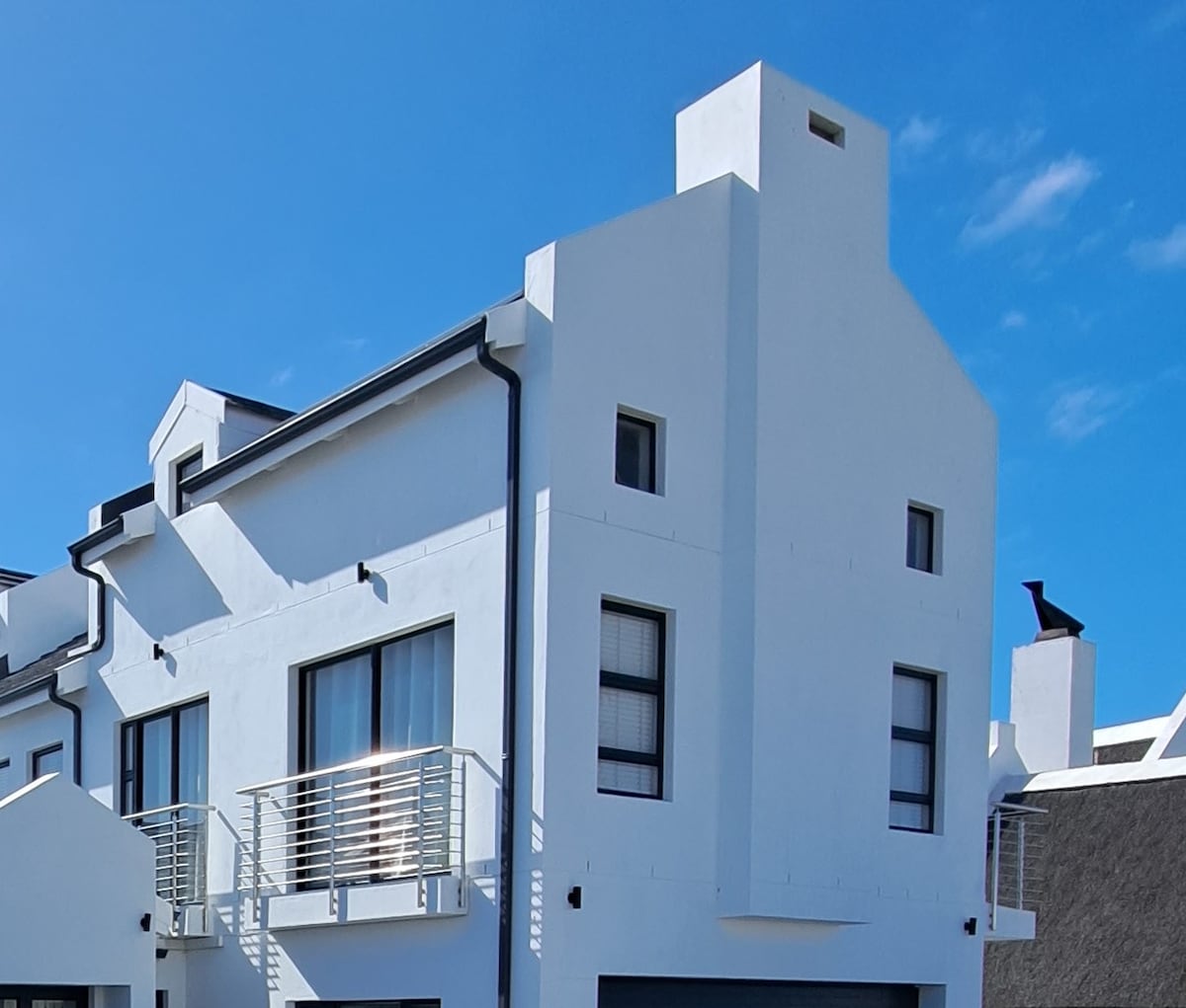 This 215sqm, unique Johan Slee-design offers spectacular sea views & sunsets. Light filled open spaces, over-sized glass sliding doors, fireplaces and outside showers guarantee a memorable stay. Whether you spend your time lounging on a hammock, doing absolutely nothing or reading in a window seat keeping and eye out for whales or dolphins - the keyword is 'relax'. Luxurious amenities & quality linens complete the special experience. Walking distance from restaurants and Die Koelkamers Theatre.