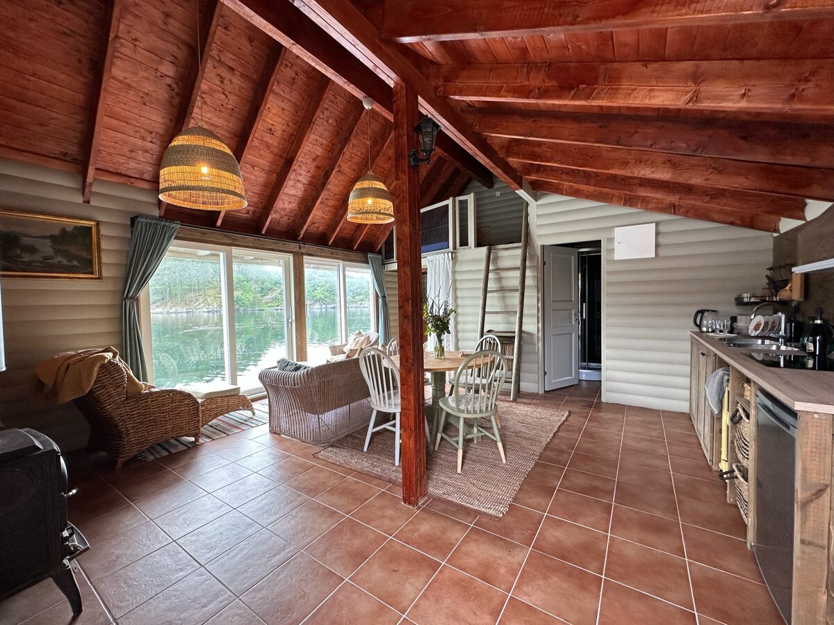 Sjøhus plassert helt i vannkanten i en stille våg – perfekt for deg som søker ro og nærhet til naturen. Her bor du tett på sjøen med fantastisk utsikt. Badstuen ligger like ved sjøhuset og kan leies som tillegg for en ekstra avslappende opplevelse. Vi tilbyr også utleie av kajakker, SUP-brett og våtdrakter, samt flotte turmuligheter på gården – blant annet topptur til Hognåsen. På gården driver vi med bærekraftig produksjon og selger egne egg, Wagyu-Angus kjøtt, samt grønnsaker i sesong.