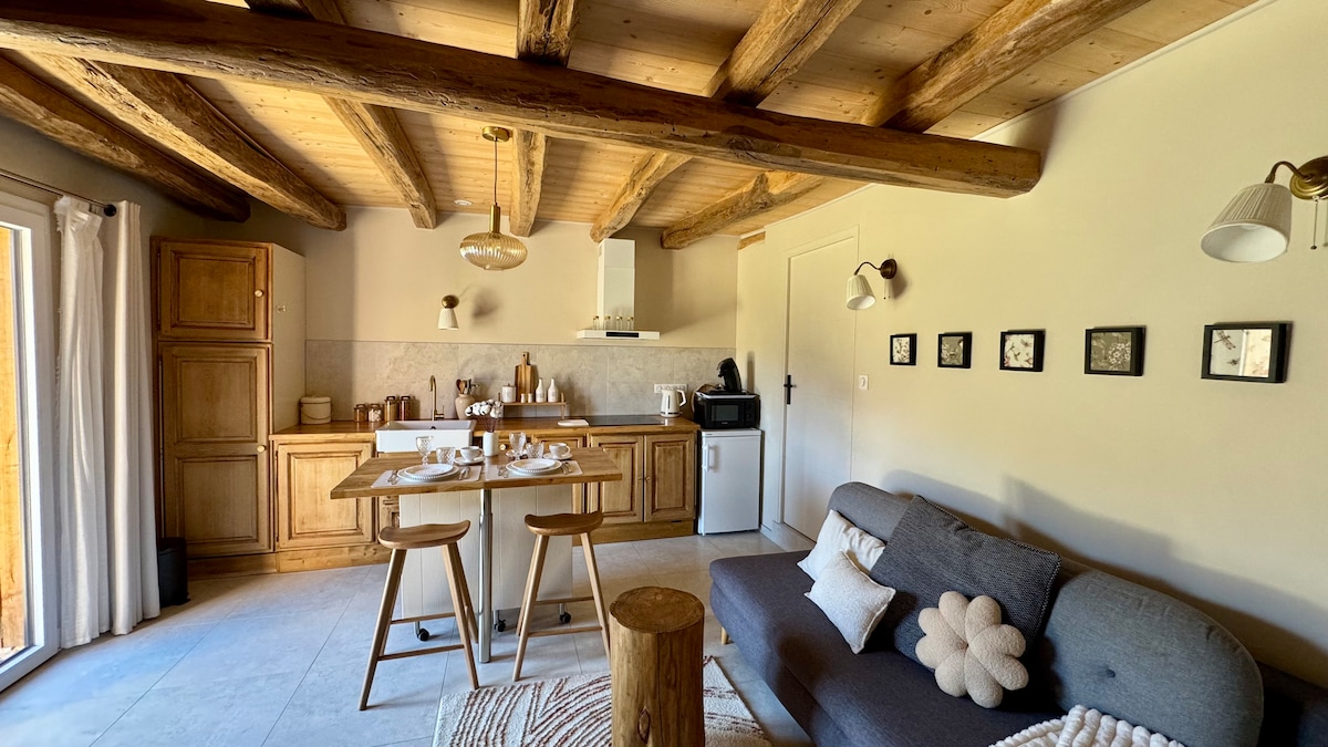 Maison Emye, Âme authentique et lieu de caractère au cœur de Montpeyroux. Découvrez une cuisine lumineuse qui dessert deux niveaux accueillants. Elle dévoile une salle de bain avec grande baignoire puis une vaste pièce à vivre aux murs bruts, belle hauteur sous plafond , canapé convertible et coin nuit au calme, Une table en bois et enfin une terrasse intime pour un bain sous les étoiles. À l’étage chaque détail inspire la sérénité d’une Suite élégante avec vidéoprojecteur et douche pour deux.