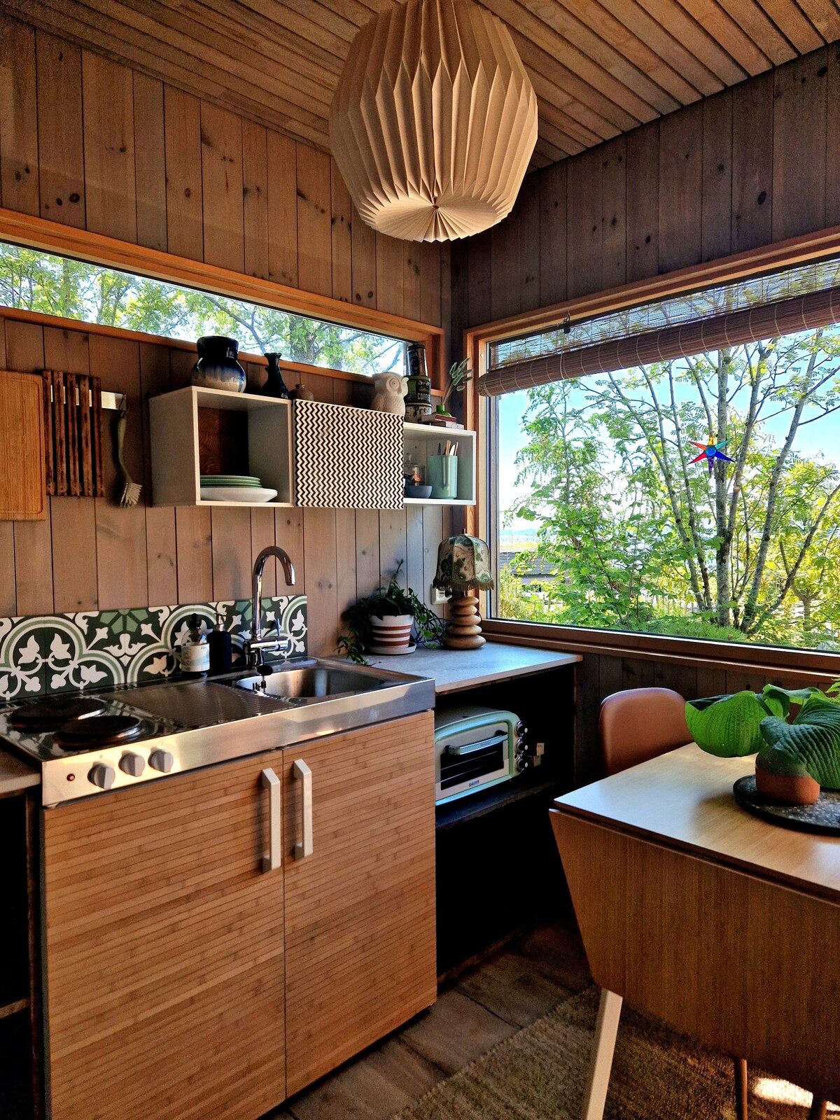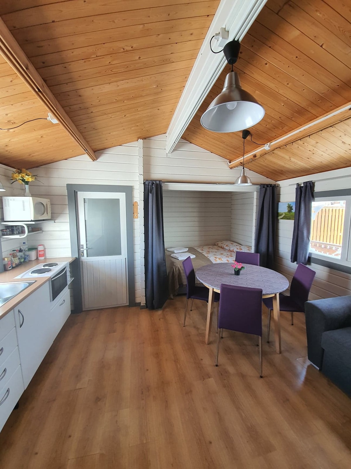 Lite Studio på 14m2 med alt du trenger. Den er i nærheten av nydelige strender, familievennlige aktiviteter som bading, strandvolleyball, fiske og ikke minst fantastiske turmuligheter i mark og fjell direkte fra hytta. Vi har Standup paddleboards (SUP) som kan lånes gratis. Eget privat uteområde med spiseplass, grill, hengekøye og vedfyrt bålpanne. Hytta har utedusj, kjøkken, toalett og dobbeltseng. Det er i nærheten av offentlig transport og butikk