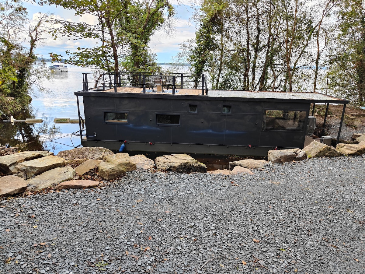 Unique boathouse escape! Tucked in woods, near Garrykennedy. Perched on Lough Derg, secluded yet convenient. Meticulously outfitted. Relax on the boathouse roof or explore nature. Indulge in private, covered hot tub & fire pit (€120/2 nights: cleaned, heated with firewood, no chemicals added). kayaks available. Disconnect from city life, immerse in nature's calm. Your extraordinary retreat awaits! Larkins Restaurant i only 4 min drive.
