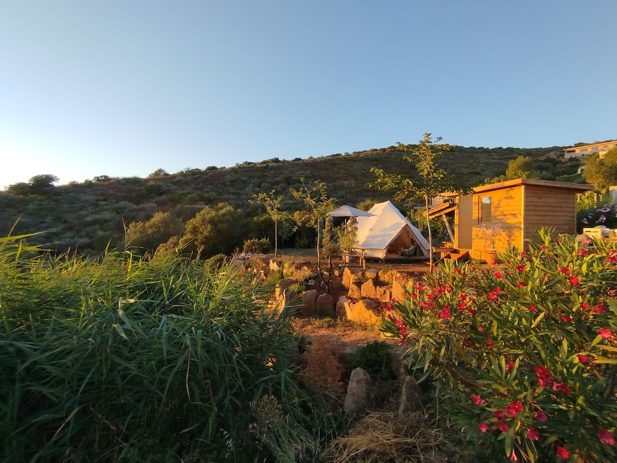 A 5 minutes ou 2 km en voiture des plages et des commerces de Sagone vous serez au calme sur une colline a 150 m d'altitude avec une vue imprenable sur le golf de Sagone orienté ouest pour les coucher de soleil. Un Tipi de 24m2 en coton avec une salle de bain indépendante et une cuisine extérieure avec toutes les commodités pour un couple qui souhaite se ressourcer dans la nature. Nous avons des poules, des chèvres, des canards, des lapins et beaucoup d'arbres fruitiers. Xavier et Pauline