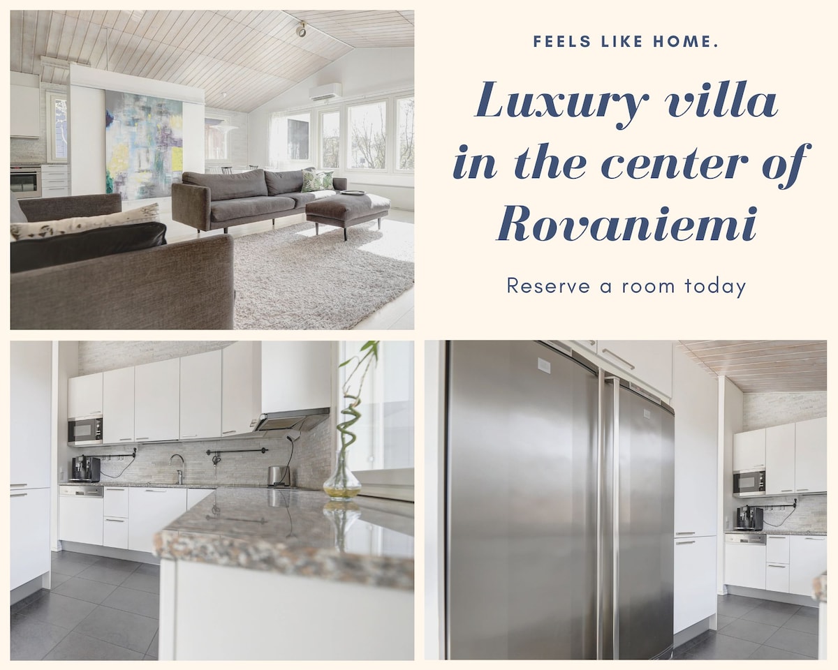 Luxurious and atmospheric 70 m² home on a forested hillside, just 3 km (5 min) from Rovaniemi city centre. Here you can enjoy peace and quiet while still being close to all services. The home features a spacious living room, fully equipped kitchen, sauna, and two bedrooms for up to 6 guests. The private backyard forest includes a small sledding hill, and you can spot the Northern Lights from the yard. Linen, towels, WiFi and free parking included. A perfect Lapland stay. Car rental available.