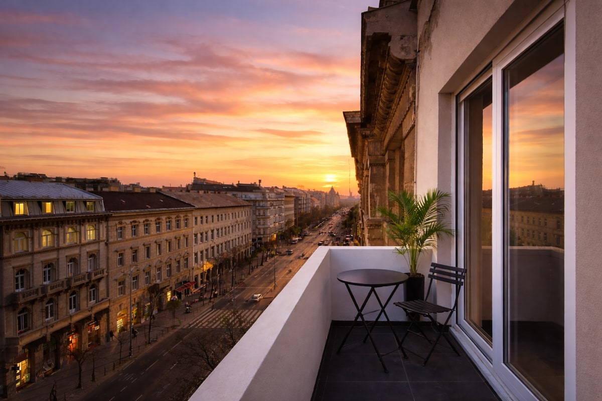 Completely renovated 3rd floor Apartment based on individual plans in the 7th district next to the Corinthia Hotel. The Apartment has 3 bedroom and 2 bathroom. 45sqm living room with American kitchen and panoramic views of the Grand Boulevard. The kitchen is fully equipped: dishwasher,fridge,oven,hob,microwave... Nespresso coffee machine with free capsules. All rooms and the living room are air conditioned. The Apartment is centrally located,most attractions within walking distance.