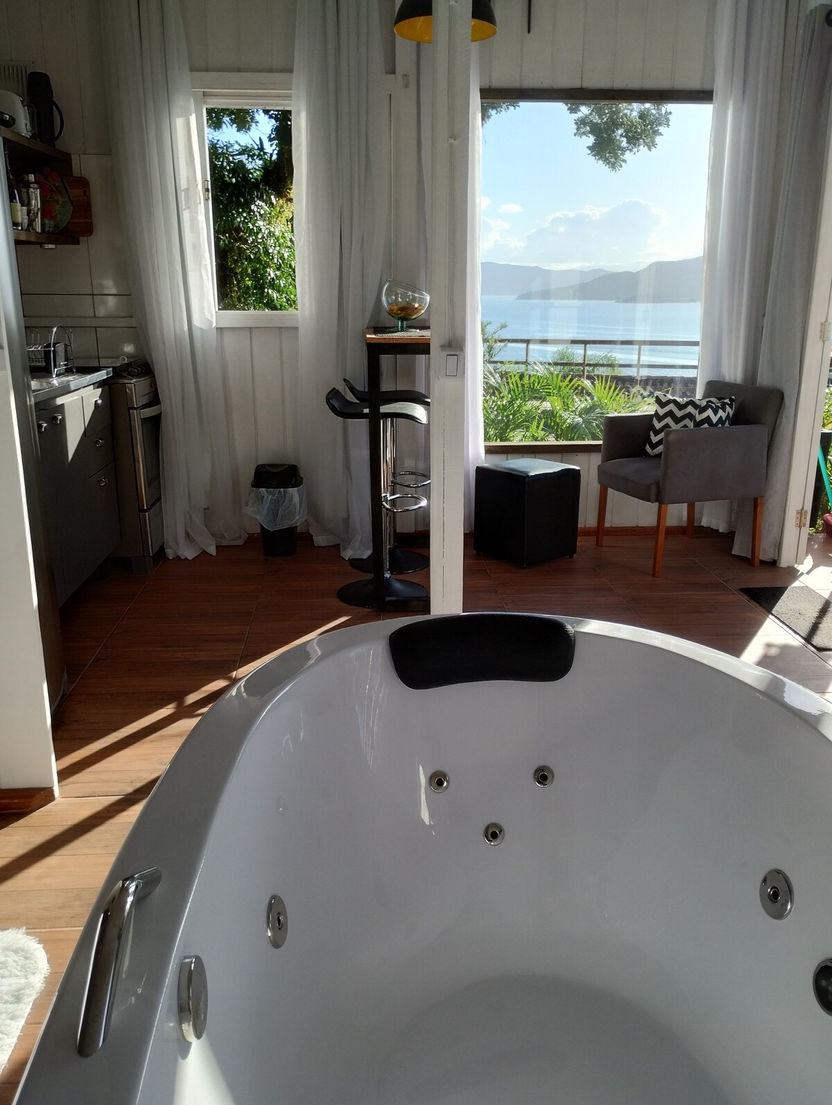 Relaxe neste lugar único e tranquilo, de vista para o mar, entre as praias do Forte e Jurerê Internacional. O casebre possui: * Roupas de cama e banho * Cozinha completa: * Forno * Fogão * Geladeira * Microondas * Louças e utensílios * Sanduicheira * Jarra Elétrica * Liquidificador * Pipoqueira elétrica * Torradeira * Cafeteira de Cápsulas ( marca Três Corações) * Banheira de hidromassagem * Área com churrasqueira