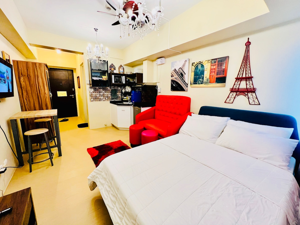 Well maintained studio unit(for 3pax) @the heart of the city near Ayala Centrio Mall. At 15th floor with double-size bed & big sofabed. These are 4 adjacent studio units (if you’re in a big group up to 12 pax). Equipped with high speed Wi-fi (200mbps) Globe Parafiber, Smart TV & Netflix. Full kitchen with complete utensils & FREE a gallon of drinking water. Overlooking the super nice pool(adult & kiddie pool). Nearby are food outlets, laundry shops, 24/7 convenience store & bars. Book now