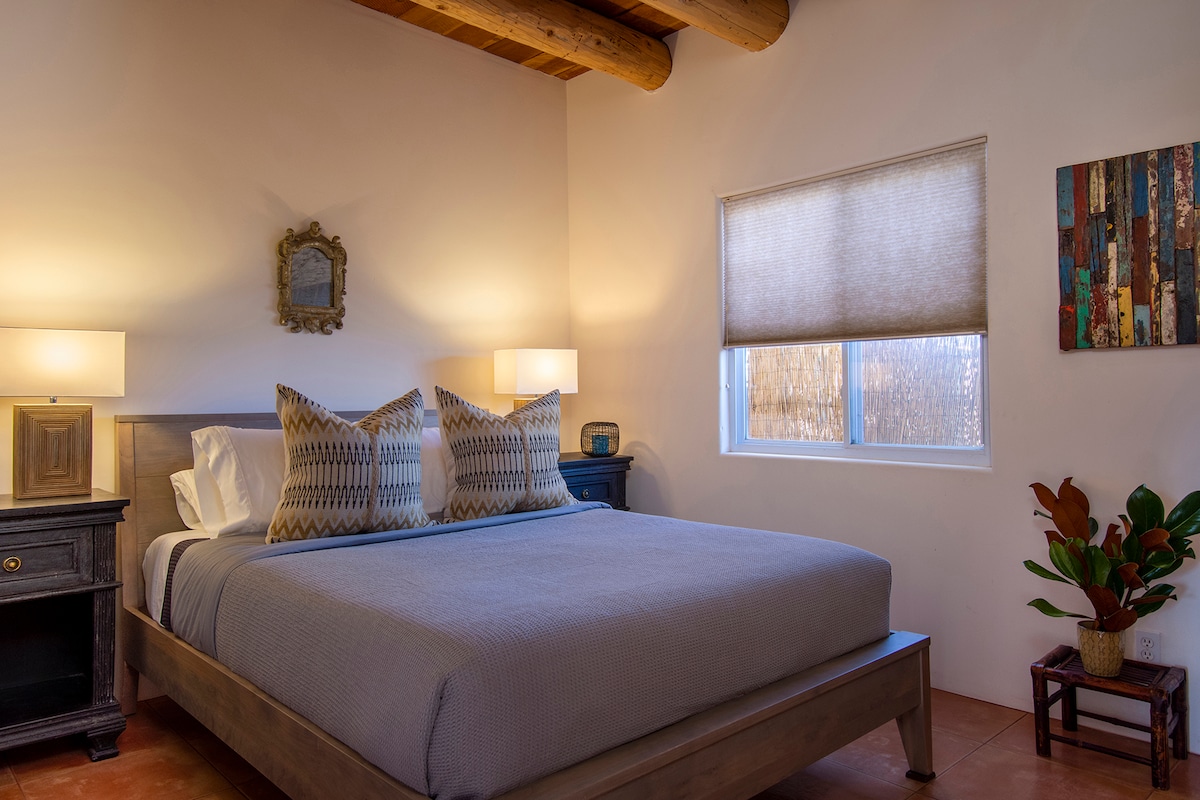 PERFECT SPOT FOR A GETAWAY! A no-smoking, one bedroom retreat-like unit has tons of character. Stroll to the Plaza and restaurants. Enjoy the private patio off the bedroom or the lovely courtyard with calming fountain and many benches. Ideal for reading, thinking or meditation. Many guests have been "working from home with a different view"! One family dog (under 25#) is OK – and you must inquire in advance. The cozy paradise is a combination of the Taos vibe with contemporary touches.