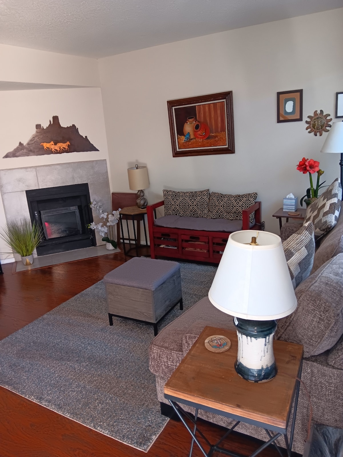 A warm and stylized condo located in the hip Railyard district known for its trendy arts and culture. Centrally located with just a little over a mile to the Santa Fe historic Plaza and walking distance to some of Santa Fe's most beloved cafes and restaurants. Take the trail and walk or bike directly to the new underpass Acequia trail and get into downtown in 15 minutes, close to Wholefoods, Trader Joe's and Meow Wolf. Beautifully decorated and great amenities with all the comforts of home.