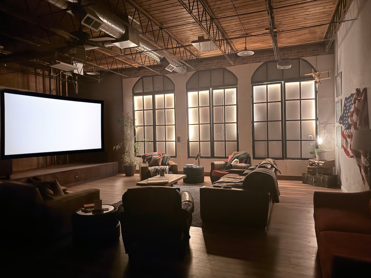 Zen Loft — a former yoga studio next door to a private spa with yoga, infrared sauna, & self care services.Perfect girls’ get away, couple's connection, wellness retreat and or spa staycation. • 14’ ceilings • Oversized French windows • Large open living space • Floating daybed • Aerial silk hammocks • 3 dedicated work spaces • Outdoor lounge, bistro lighting & fire pit • Curated accommodations for 8 • Central location Modern industrial meets peace & calm for this intimately expansive stay.