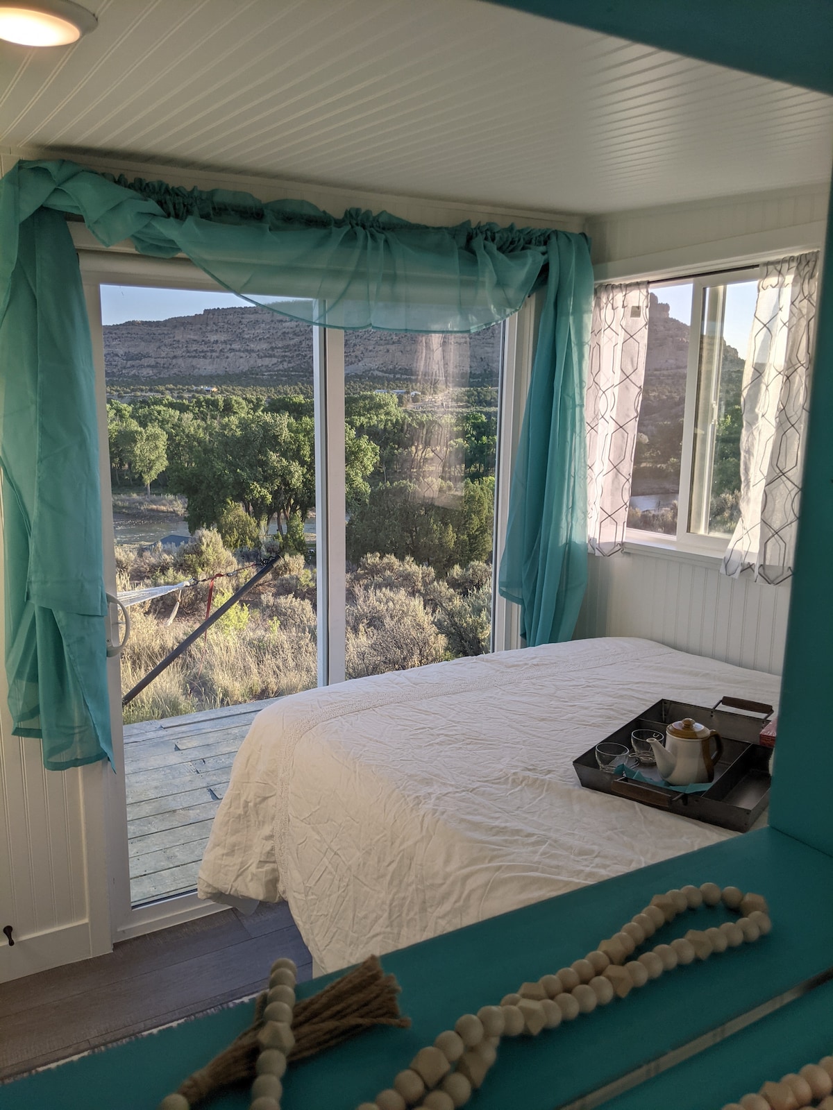 small, super clean and peaceful. get some peace and quiet overlooking the San Juan River, with inspirational views. has private hot tub and gas fire pit. Discover many activities. boating ,fishing ,kayaking ,hiking,wines of the San Juan, ruins and petroglyphs , and dirt biking , etc 420 friendly. has coffee maker and coffee and complimentary snacks and filtered drinking water provided. also a kitchenette with microwave, electric griddle with all utensils and dishes charcoal and barbecue grill