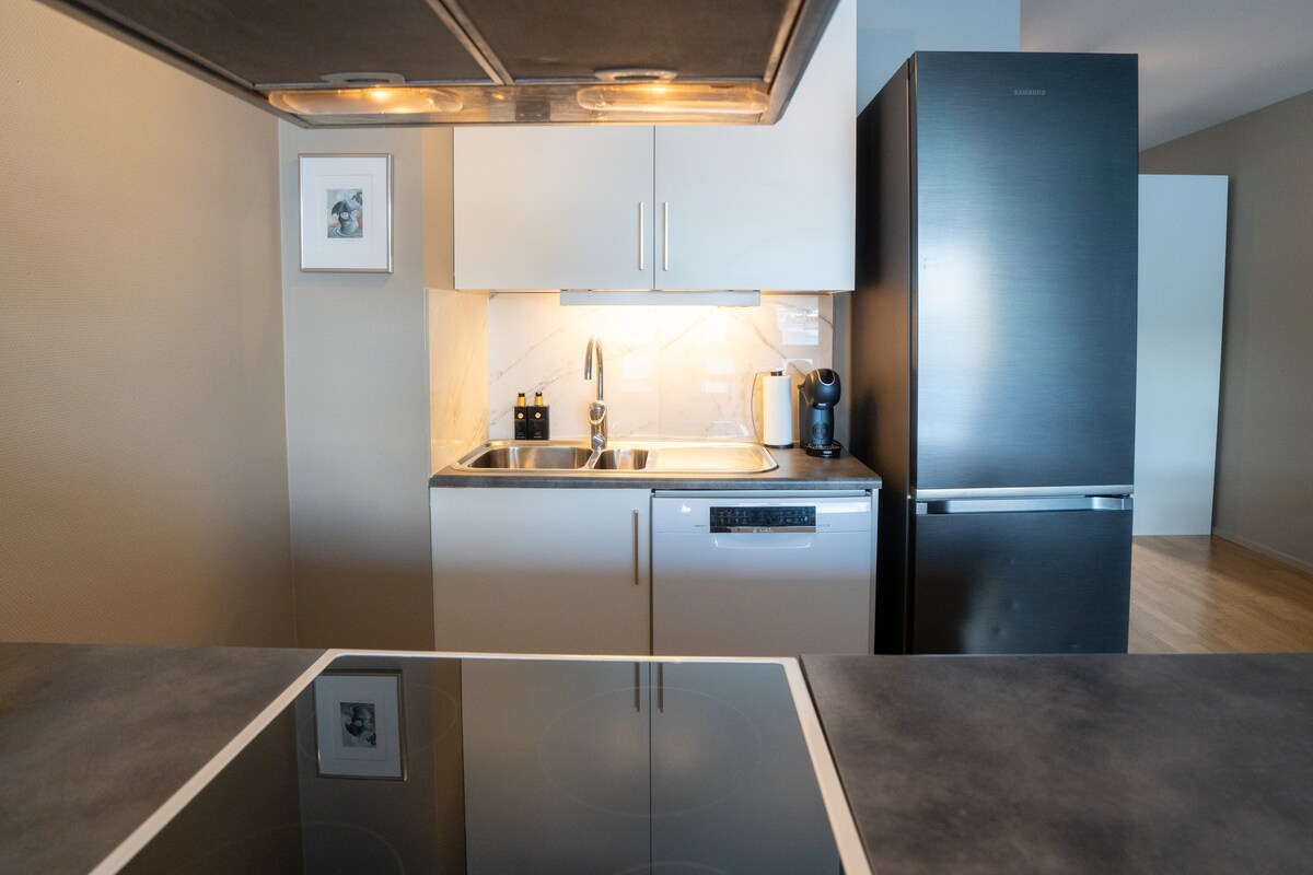Denne flotte og sentrale leiligheten ligger i 2 etasje og er 43 m2. Leiligheten inneholder gang, soverom, bad og stue med kjøkkenløsning. Det er også en privat balkong. Vervet area is a newly developed district in Tromsø, with restaurants, cafes right by. The city center is only a 5 minutes’ walk from the apartments, same for the Artic Cathedral across the bridge. The apartment building is modern and placed right by the harbor.