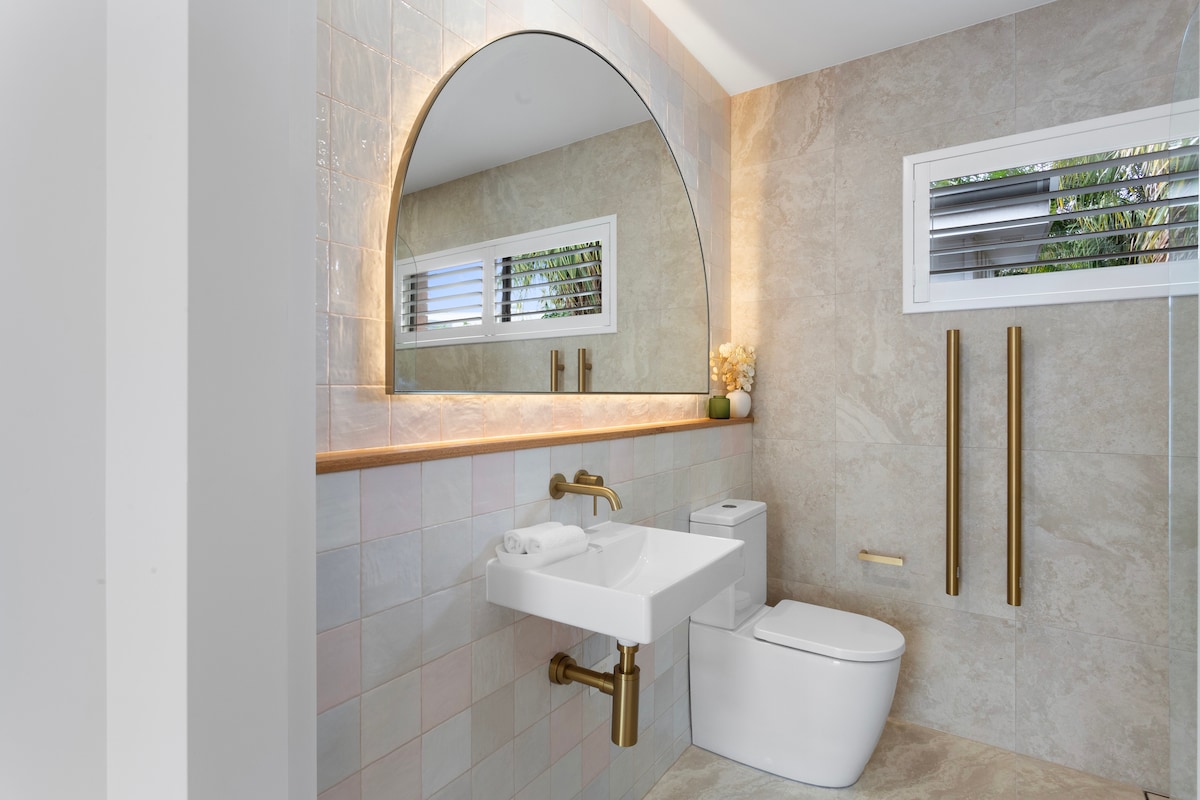 Unwind in a hanging chair on your private deck surrounded by lush gardens. Light-filled and calm, the suite is a tranquil space for the discerning traveler. Created by award-winning architects, Bask & Stow has been designed with a nod to Palm Springs, mid-century design and relaxed coastal living. Located a stone’s throw from Wategos, Arakwal National Park, town, beaches and right near the iconic Top Shop café.