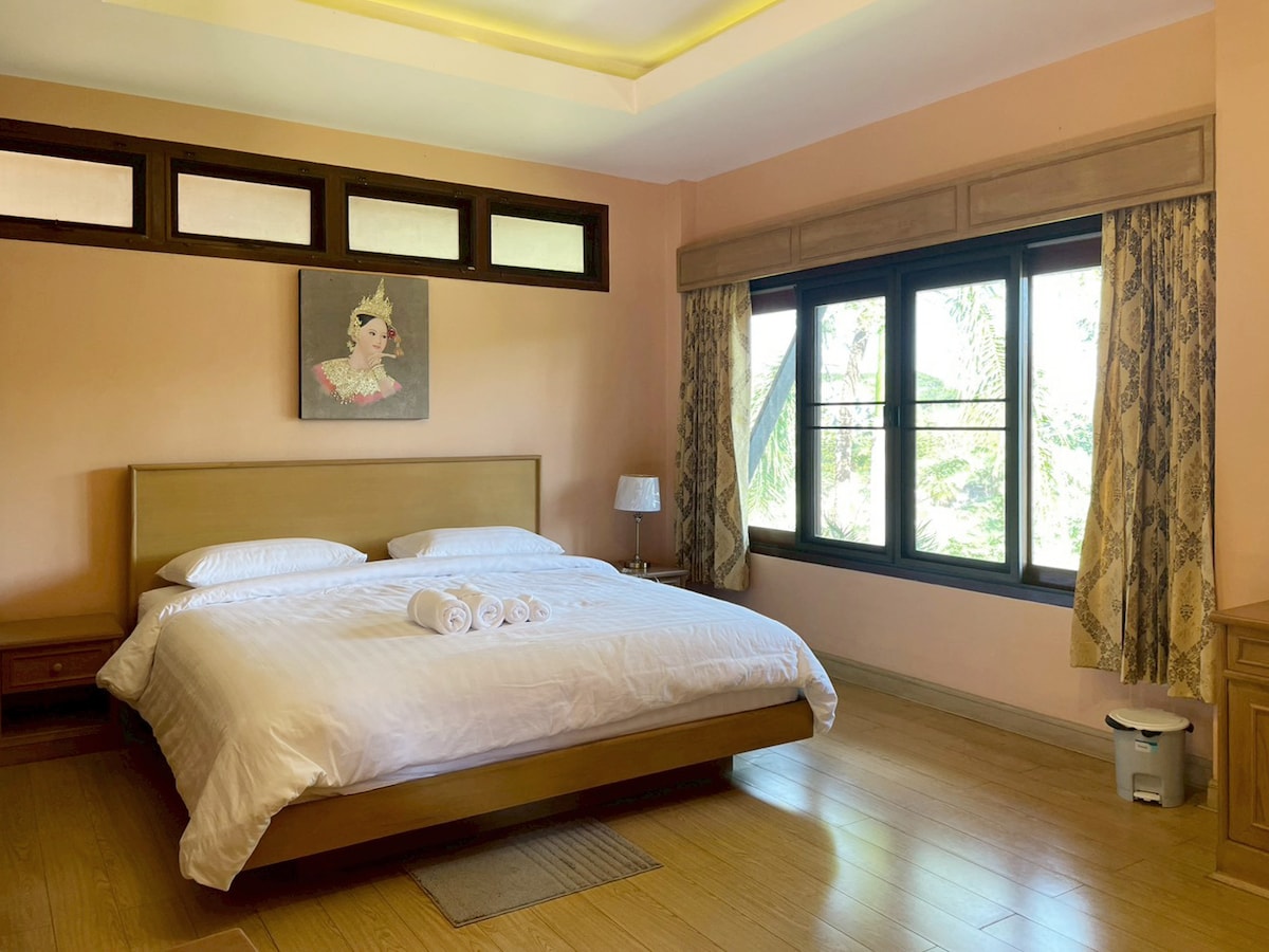 您好!我是一名珠宝设计师,这是我首次尝试设计房屋。此刻,我怀着无比激动的心情与您分享这个全新设计建造的空间。这座房子旨在将清迈传统兰纳风格与热带殖民元素相融合,营造出复古、现代与精致并存的独特氛围。 此房源位于机场南面,距离宁曼路和老城区约25分钟车程。如果你想避开繁忙的旅游区,深入体会清迈当地的旅居生活,享受宁静私密的别墅度假时光,或者只想不受打扰得工作,阅读,思考,发呆,这会是个合适的地方。如果您喜欢夜生活和热闹的人群,那位于市区的住宿会更适合。 这里出租的是位于一楼的独立客房,这个房间正对着私人泳池,配有独立出入口,私密性极佳。您可在户外沐浴阳光享用茶点、咖啡或餐食。房源配有200多平方的大草坪,设有烤火炉和休息区,我和家人居住在二楼。