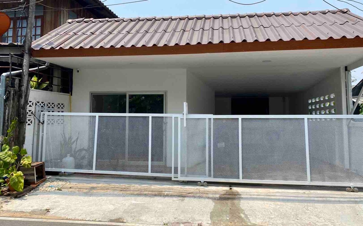 It is a one-story white house. Minimal style in the heart of Chiang Rai. Sleeps 4-6 people, can bring 1 pet free of charge. 33 square meters, near Central and many famous entertainment venues (take Club, Tawandang, Unseen, Library, Single) Convenient to travel like staying at your own home. There are privacy, 2 bedrooms, 2 bathrooms (both air-conditioned rooms), 1 living room, 1 kitchen with cooking equipment, TV, refrigerator, microwave, 1 hall, 1 car garage. There is a motorbike for rent.