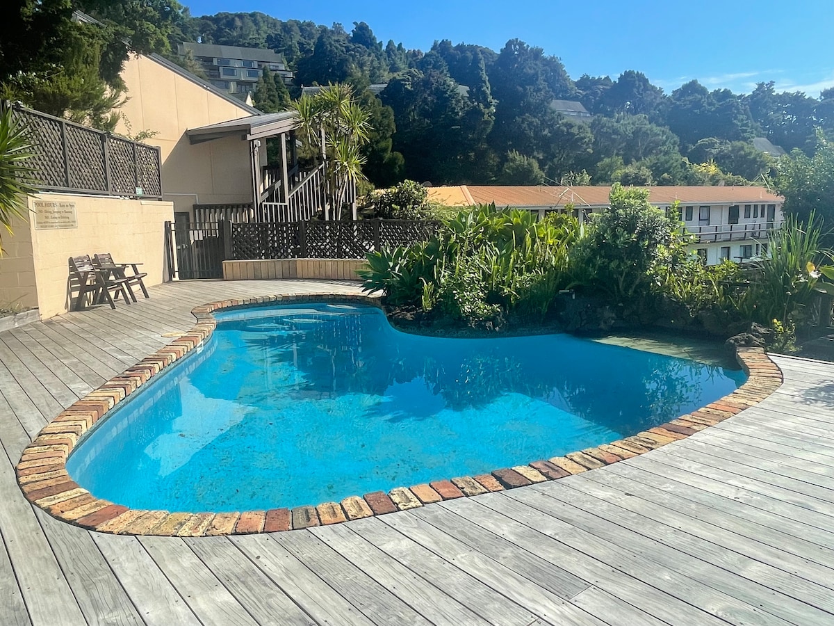 Perched on the hill just a short walk from the marina and waterfront we enjoy views of our stunning NZ landscape from the Waikare Inlet to the surrounding bushclad hills and a clear night sky. One of 4 units if a boutique motel this patio studio is a ground floor, easy access, self contained unit with private courtyard. It is stylish and spacious with open plan kitchen/dining/living area. Close to all the activities to enjoy in the Bay of Islands - sailing walking cycling and history.