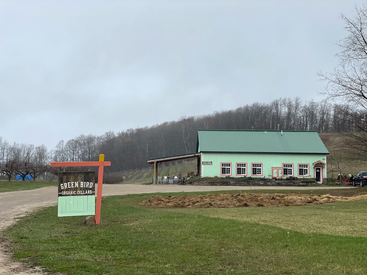 Stay on Leelanau’s only organic vineyard and farm (Green Bird Organic Cellars). A cozy, romantic space next to the vines, apple trees, sheep and chickens. This one-of-a-kind stay puts you close to everything in Northport & Leland, while allowing you to enjoy the natural beauty of our family-run winery. The space has a private entrance, a lofted bed with a ladder (best for folks with full-mobility), a living/dining area, a fridge/microwave/keurig and a full bathroom with a shower.