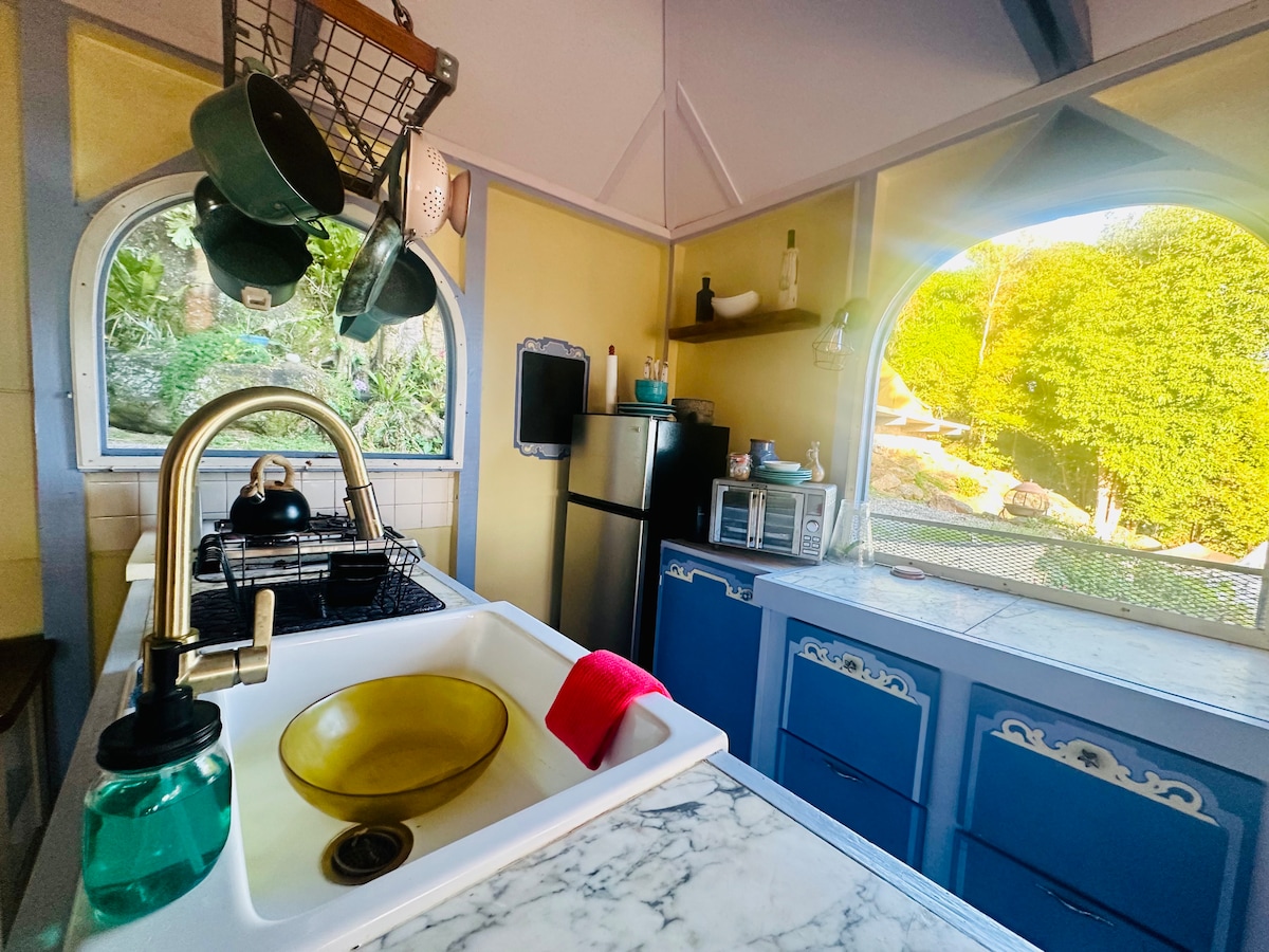 Mango is an intimate, nature-forward glamping hideaway surrounded by mango trees and ocean views. With 360° windows and a skylight, the space is bathed in natural light and connected to the outdoors at all times. Guests enjoy a queen bed, outdoor seating, boho-style amenities, and access to Casita Orquídea’s serene communal spaces—perfect for slowing down and recharging.