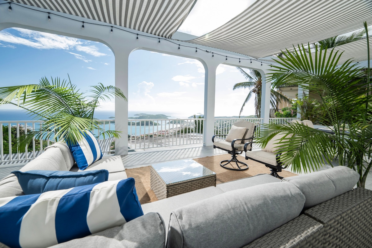 New!! This beautifully updated 3-bed, 3-bath villa is centrally located, offering spectacular views of the vibrant town, bustling cruise ship docks, and mesmerizing sunsets. Enjoy a private terrace where you can soak in the stunning vistas and unwind as the sunsets on the horizon. Villa Skyline is just moments away from excellent shopping, gourmet restaurants, and local attractions. The island's best beaches are only a few minutes away, making it easy to enjoy sun-soaked days along the shore.