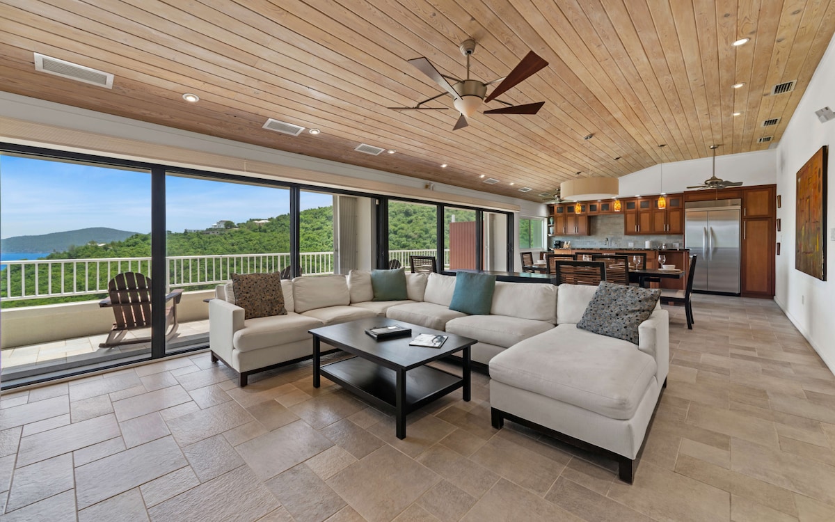 Escape to Sunrise Villas by Stacie, a private tropical mountaintop retreat in St. Thomas. Enjoy panoramic ocean views, a heated pool with Baja sun deck, jets, and lights, plus elegant indoor-outdoor living with 20-ft sliding doors, gourmet kitchen, bar, and fireplaces. With a whole-home generator, comfort is guaranteed. Perfect for couples, families, or friends—book the villa next door for up to 6 more guests.