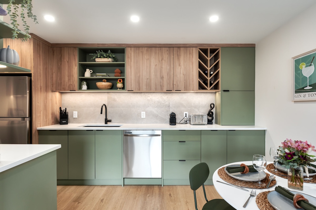 Enjoy a stylish and quiet experience at this centrally located place. 10 min drive to downtown and 1hr 23min to Banff. Contemporary appliances, designer furnitures, and a fully supplied whole kitchen! Stream movies and shows on our high-speed wifi and experience our excellent guest service that meets all your needs. Keyless self check-in through emailed guide makes entrance flexible and easy. Parking is free and always reserved for you. Visitors can park on the street for free.