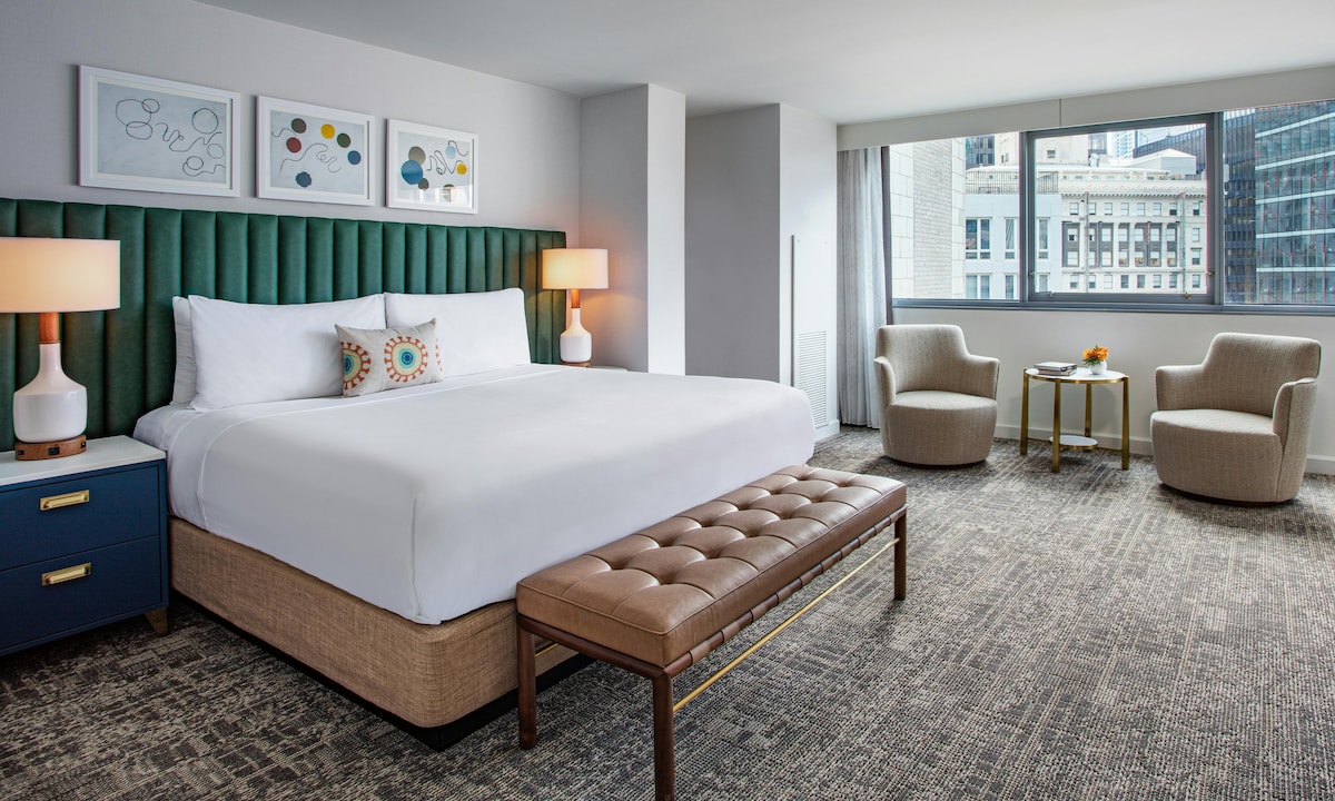 The Hoxton, Chicago feels like a home away from home, with its comfy hotel rooms, great food and a rooftop to soak up some rays in the heart of Fulton Market District, one of Chicago's most creative neighborhoods. All rooms come with mid-century furnishings, modern bathrooms, and warehouse-style floor-to-ceiling windows to show off Chicago in full.