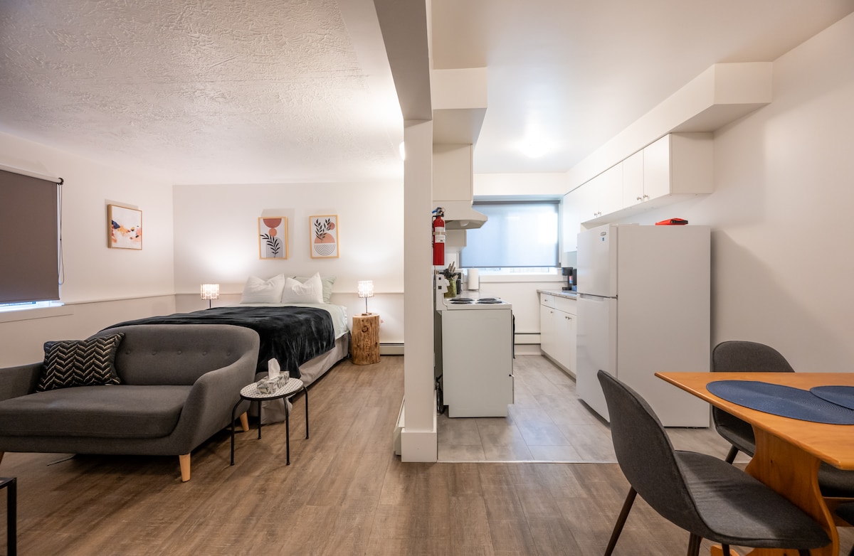 Modern 1 bedroom, 1 bath in the heart of downtown Whitehorse. Free powered parking just steps from the building entrance. This unit is within walking distance of all downtown Whitehorse has to offer... Yukon River, restaurants, coffee shops, conference centers, bus stops, local shops and so much more. Note to past guests that this until no longer has a second bed in the spare room this is now a one bedroom/bed unit with an office. It’s only suited for a couple or a single person.