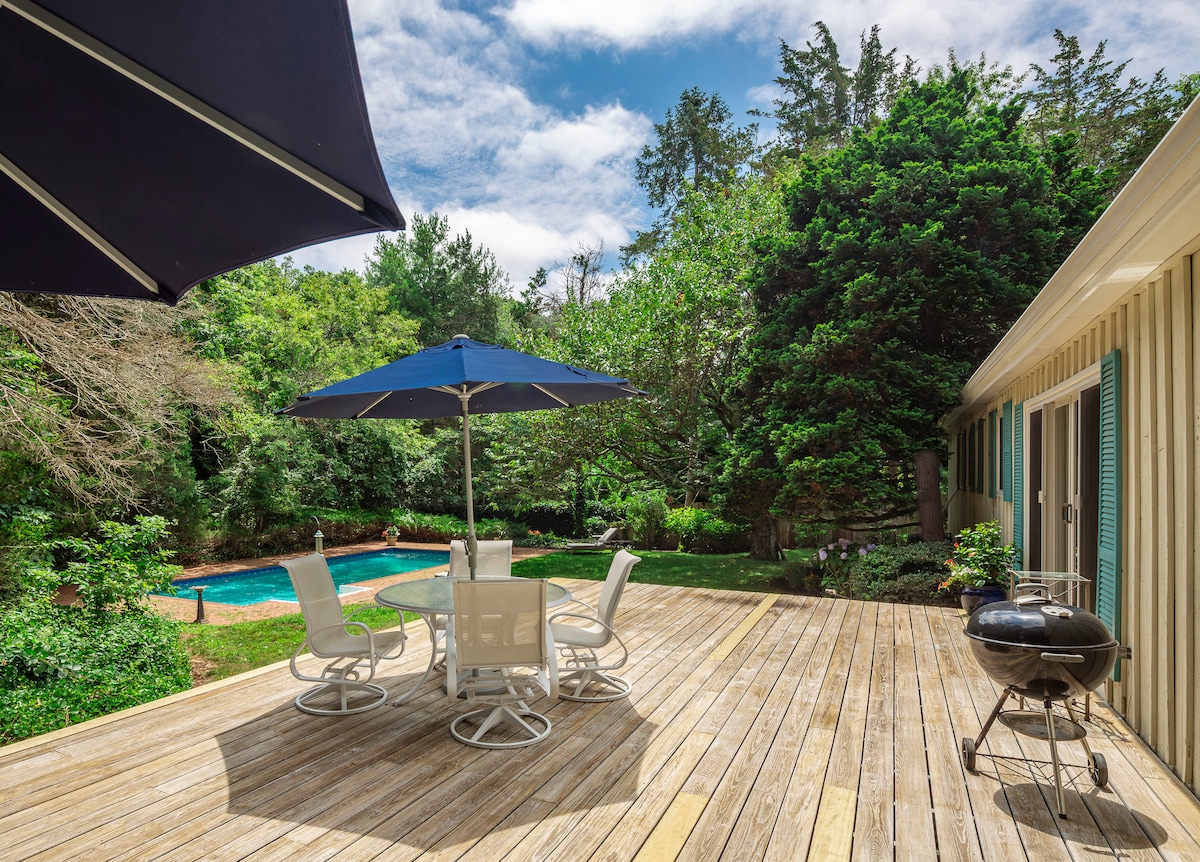 Contemporary 4-bed + 4 1/2 bath home sitting on a park-like acre of gardens. Swim in the large pool (opens 04/25 and closes mid-October (there's an additional charge for heating - see below), relax in a hammock or bbq on the deck. Play ping-pong, darts, pool or take a 15 min walk to private bay beach to swim and paddle board. Or drive 15mins to the Atlantic beaches and visit picturesque Sag Harbor, Montauk. Reduced cleaning fee for small groups. RentReg RR-25-399 Local taxes included