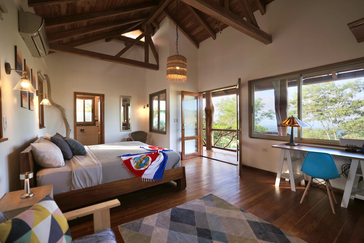 A spacious land nestled among fruit trees, Ceibos, and Guanacastes, our artistic abode invites you to unwind in a tranquil atmosphere. Adorned with handcrafted touches, this sanctuary blends rustic elegance and modern comfort. with one master bedroom and one kids room, This home is ideal for a family with young kids as it is walking distance to Wild Child Play Garden, 10 min. drive to Guiones beach, 7 min. to Pelada, and 10 min. to Ostional, a world renowned sea turtle breeding sanctuary.