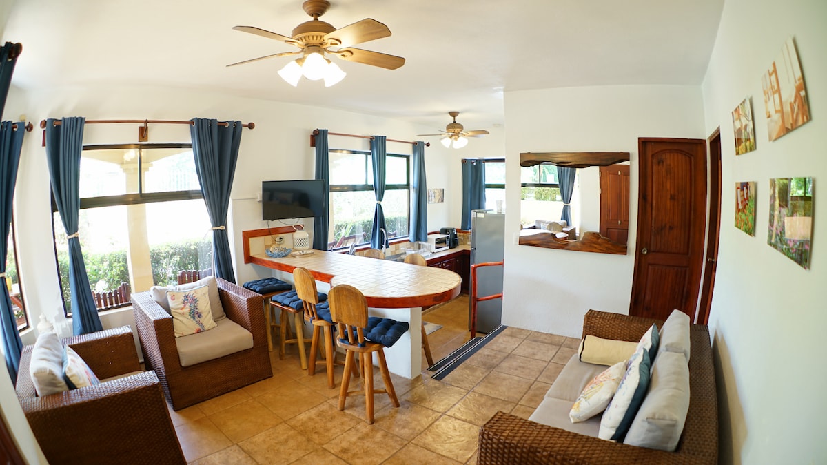 Located in a sought after location in Playa Guiones, it is a short 3-minute walk to the beach and an easy stroll to the many restaurants in the area. This 1-bedroom unit has a king size-bed, and a double size sofa bed in the sitting area. There is a small kitchen and a comfortable outdoor patio area with a table and chairs. Need to work? No problem, there is a dedicated work area. It shares the common property (pool and outdoor rancho). It is Ideal for couples who enjoy a little extra space.