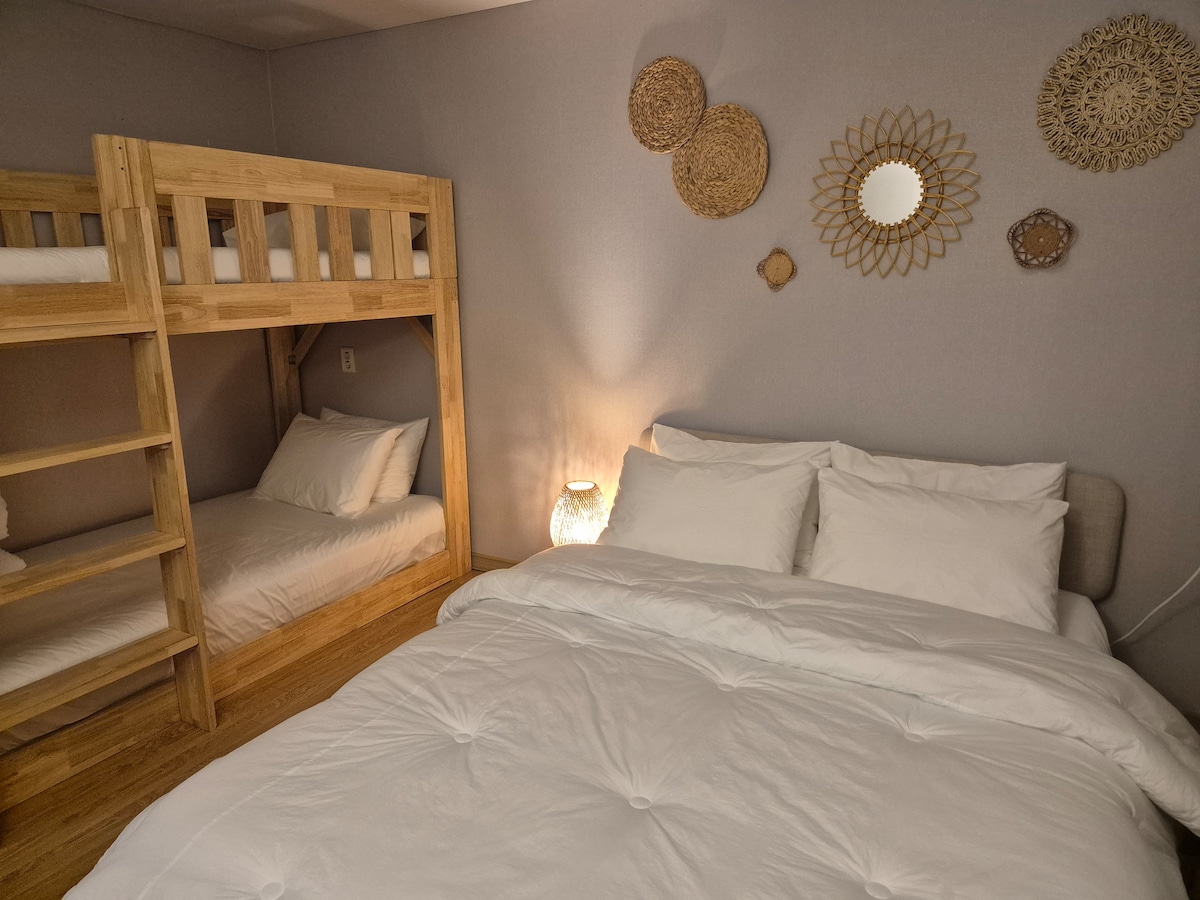 중심부에 위치하면서도 조용한 숙소에서 편안한 시간을 보내세요. 1. 호실내 방3개 침대 3개가 비치되어있습니다. 각방에 에어컨이 있습니다. 2. 전자렌지,인덕션,전기포터가 있습니다. (조미료는 없습니다. 고기 구워먹는건 절대 금지입니다.) 3. 건물내에 주차는 차량 1대만 주차가능 합니다. 4. 샴푸,린스,바디,샤워볼은 비치되어있습니다. (치약 칫솔은 없습니다.) 5. 세탁기, 건조기는 없습니다. 인근 동전빨래방을 이용해주세요^^ * 소음 주의 안내 모두가 편안하고 조용한 공간에서 여행을 준비하고 마무리할 수 있도록 저녁 10시 이후엔 소음발생해 주의해주세요^^