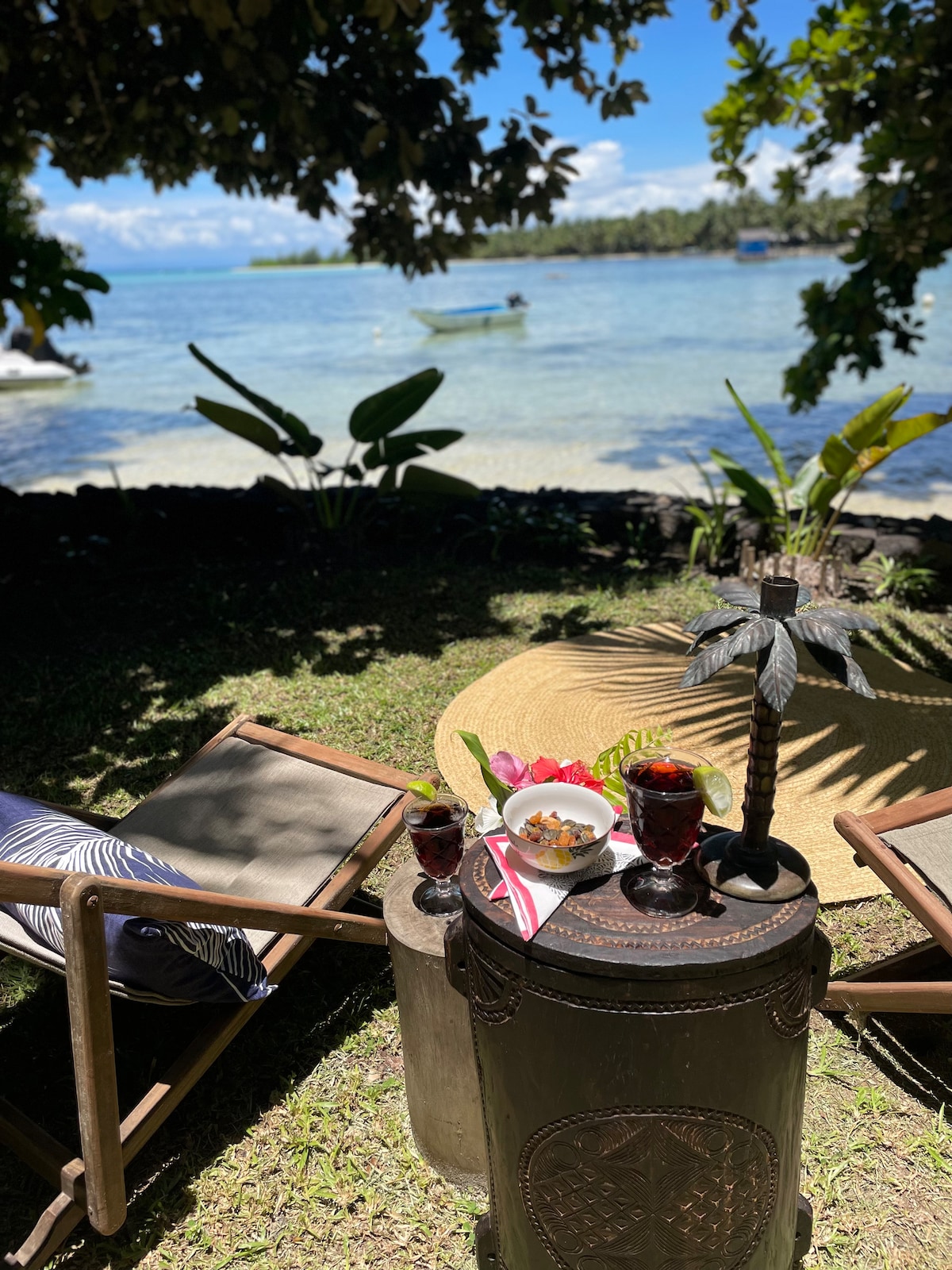 Sous les cocotiers, une très jolie structure au bord de l’eau abrite de spacieuses villas toutes de bois vêtues. Ces bâtisses traditionnelle sont dirigées par des gouvernantes en charge du ménage et du linge qui peuvent aussi préparer les repas à la demande. Face à la mer, la terrasse du restaurant la Varangue propose des plats raffinés et de délicieux cocktails à siroter au bout d’un ponton de bois qui s’étire sur le lagon vert émeraude. Chez nous le client n’est pas roi, c’est un ami.